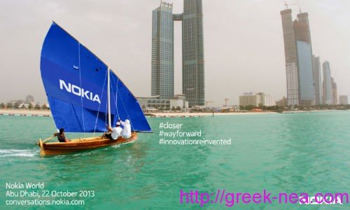 Φαίνεται πως οι Φιλανδοί άρχισαν να κρυώνουν λίγο, και για αυτό αποφάσισαν να σαλπάρουν προς τα Αραβικά Εμιράτα, και συγκεκριμένα προς το Άμπου Ντάμπι. Η φήμες που υπήρχαν από την προηγούμενη δημοσίευση που είχε αναρτήσει μέσω του twitter η Nokia “ήρθαν και έδεσαν”. Λόγος φυσικά γίνεται για την καινούρια φωτογραφία που ανέβασε η εταιρία, δηλαδή ένα μικρό ιστιοπλοϊκό με πανιά της Nokia να σαλπάρει προς μια μεγάλη, και όμορφη πόλη, αναγράφοντας κάτω αριστερά την ημερομηνία της 22ης Οκτωβρίου, καθώς και αναφέρεται το Άμπου Ντάπι, όπου θα λάβει μέρος το event της Nokia.